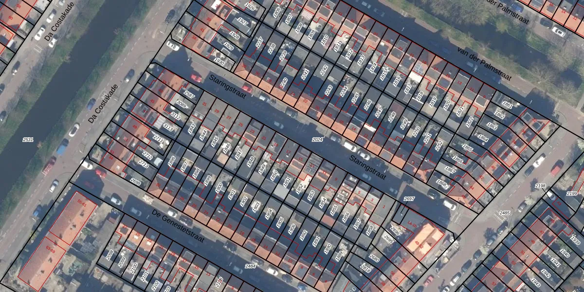 Het perceel waarop Staringstraat 17 staat heeft een oppervlakte van 94 m². Dit is een klein perceel. De perceeloppervlakte wordt geregistreerd door het Kadaster. Gedetailleerde informatie over de maten van dit perceel kunt u vinden in het rapport Kadastrale kaart met maatvoering van Staringstraat 17.