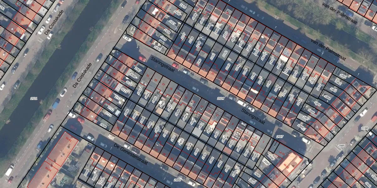 Gebruik de zoekbalk of klik op een perceel voor informatie over de adressen binnen dit perceel.