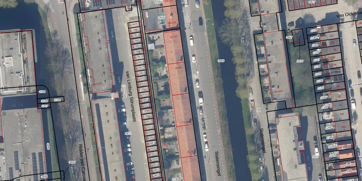 Het perceel waarop Statensingel 87 staat heeft een oppervlakte van 3100 m². Dit is een zeer groot perceel. De perceeloppervlakte wordt geregistreerd door het Kadaster. Gedetailleerde informatie over de maten van dit perceel kunt u vinden in het rapport Kadastrale kaart met maatvoering van Statensingel 87.