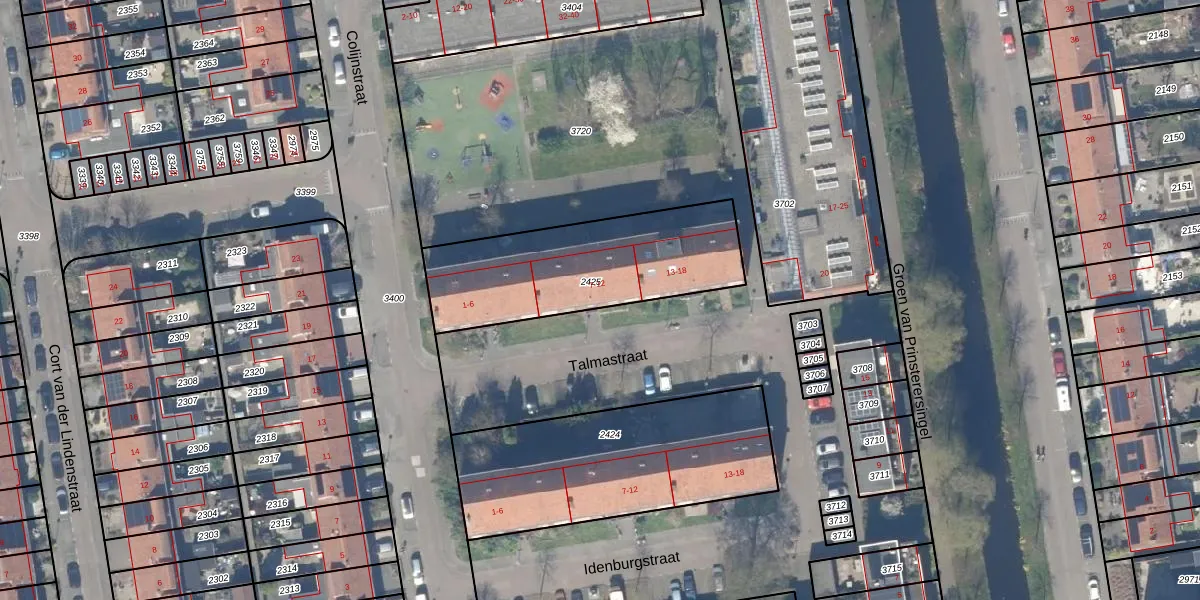 Talmastraat 10 is gelegen op kadastraal perceel GDA01I2425. Deze kadastrale aanduiding is uniek en wordt gebruikt door het Kadaster om eigendomsrechten en andere zakelijke rechten vast te leggen. Het perceel maakt onderdeel uit van de kadastrale gemeente Gouda.