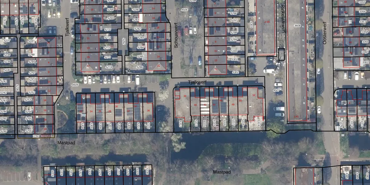 Het perceel waarop Tjalkwerf 38 staat heeft een oppervlakte van 224 m². Dit is een middelgroot perceel. De perceeloppervlakte wordt geregistreerd door het Kadaster. Gedetailleerde informatie over de maten van dit perceel kunt u vinden in het rapport Kadastrale kaart met maatvoering van Tjalkwerf 38.