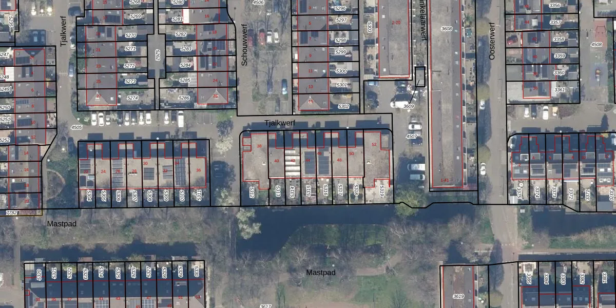 Tjalkwerf 44 is gelegen op kadastraal perceel GDA01M5315. Deze kadastrale aanduiding is uniek en wordt gebruikt door het Kadaster om eigendomsrechten en andere zakelijke rechten vast te leggen. Het perceel maakt onderdeel uit van de kadastrale gemeente Gouda.