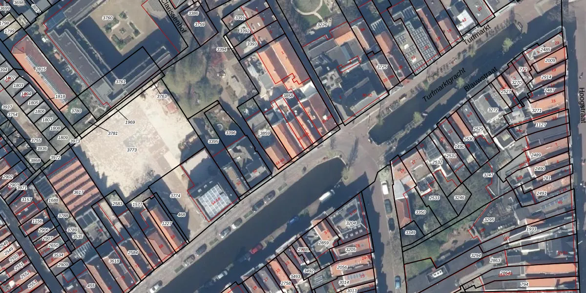 Het perceel waarop Turfmarkt 42 staat heeft een oppervlakte van 715 m². Dit is een groot perceel. De perceeloppervlakte wordt geregistreerd door het Kadaster. Gedetailleerde informatie over de maten van dit perceel kunt u vinden in het rapport Kadastrale kaart met maatvoering van Turfmarkt 42.