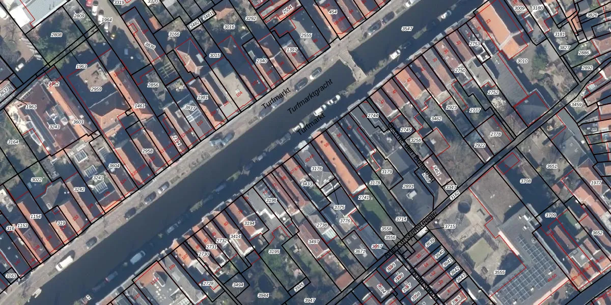 Het perceel waarop Turfmarkt 63 staat heeft een oppervlakte van 97 m². Dit is een klein perceel. De perceeloppervlakte wordt geregistreerd door het Kadaster. Gedetailleerde informatie over de maten van dit perceel kunt u vinden in het rapport Kadastrale kaart met maatvoering van Turfmarkt 63.