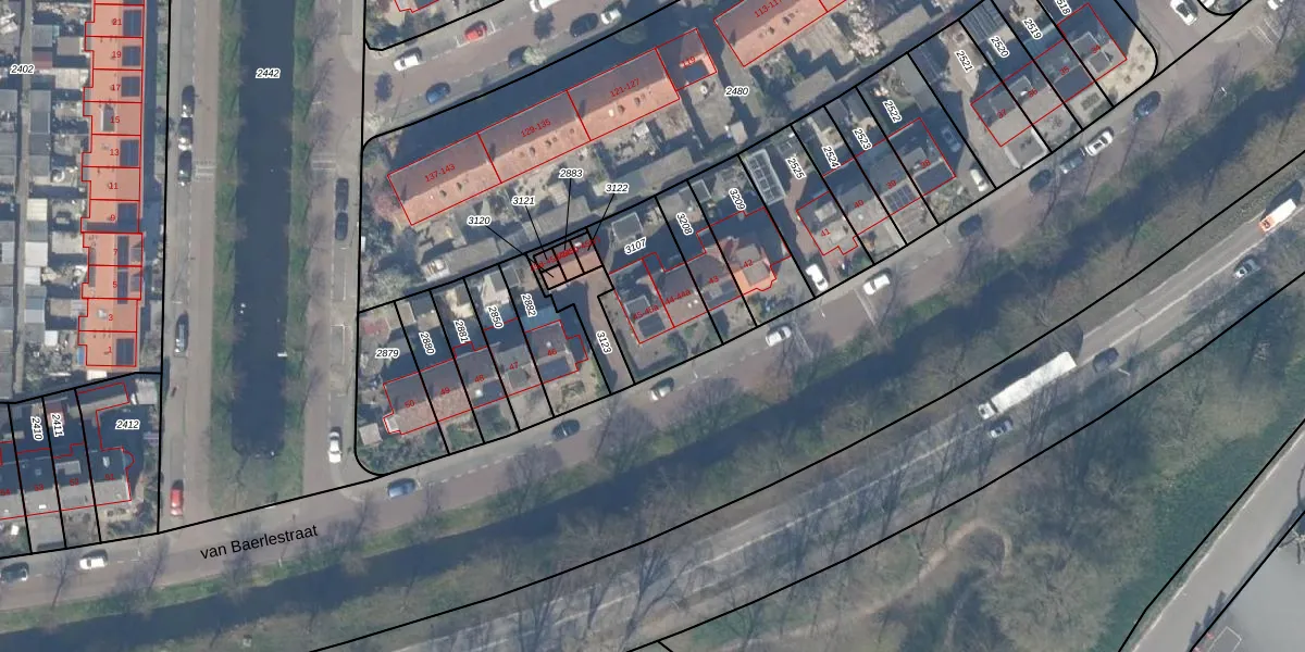 van Baerlestraat 45 is gelegen op kadastraal perceel GDA01F3107. Deze kadastrale aanduiding is uniek en wordt gebruikt door het Kadaster om eigendomsrechten en andere zakelijke rechten vast te leggen. Het perceel maakt onderdeel uit van de kadastrale gemeente Gouda.