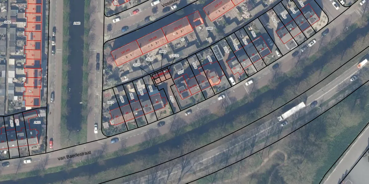 van Baerlestraat 45-a is gelegen op kadastraal perceel GDA01F3107. Deze kadastrale aanduiding is uniek en wordt gebruikt door het Kadaster om eigendomsrechten en andere zakelijke rechten vast te leggen. Het perceel maakt onderdeel uit van de kadastrale gemeente Gouda.