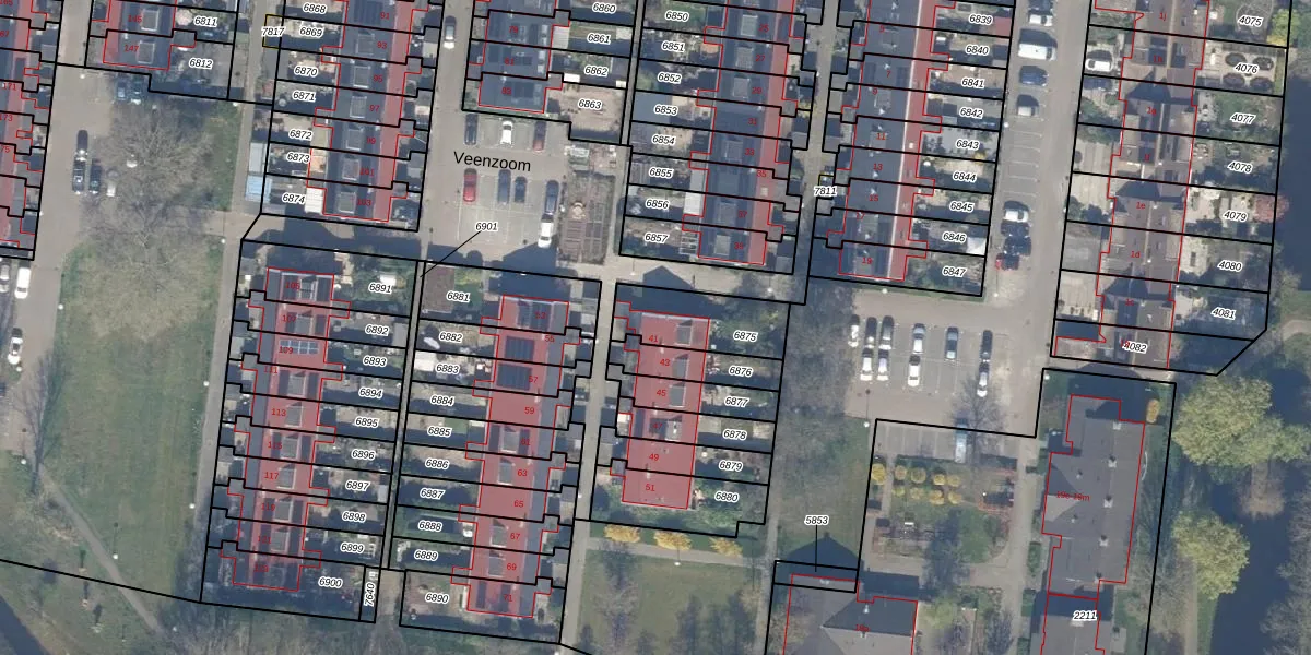 Veenzoom 41 is gelegen op kadastraal perceel GDA01M6875. Deze kadastrale aanduiding is uniek en wordt gebruikt door het Kadaster om eigendomsrechten en andere zakelijke rechten vast te leggen. Het perceel maakt onderdeel uit van de kadastrale gemeente Gouda.