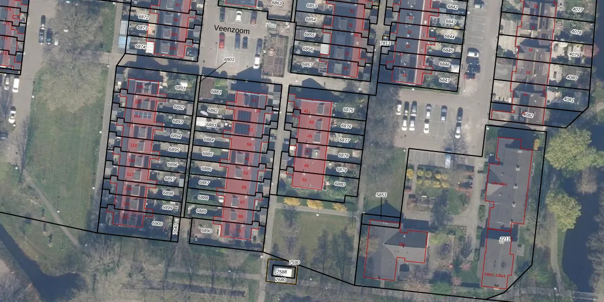 Veenzoom 47 is gelegen op kadastraal perceel GDA01M6878. Deze kadastrale aanduiding is uniek en wordt gebruikt door het Kadaster om eigendomsrechten en andere zakelijke rechten vast te leggen. Het perceel maakt onderdeel uit van de kadastrale gemeente Gouda.