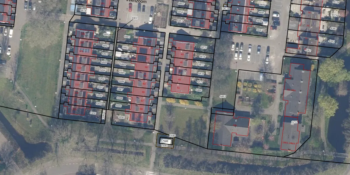 Veenzoom 51 is gelegen op kadastraal perceel GDA01M6880. Deze kadastrale aanduiding is uniek en wordt gebruikt door het Kadaster om eigendomsrechten en andere zakelijke rechten vast te leggen. Het perceel maakt onderdeel uit van de kadastrale gemeente Gouda.