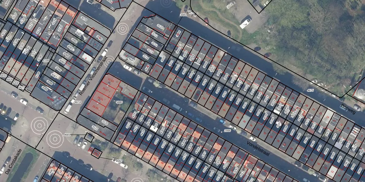 Vondelstraat 56 is gelegen op kadastraal perceel GDA01E3024. Deze kadastrale aanduiding is uniek en wordt gebruikt door het Kadaster om eigendomsrechten en andere zakelijke rechten vast te leggen. Het perceel maakt onderdeel uit van de kadastrale gemeente Gouda.