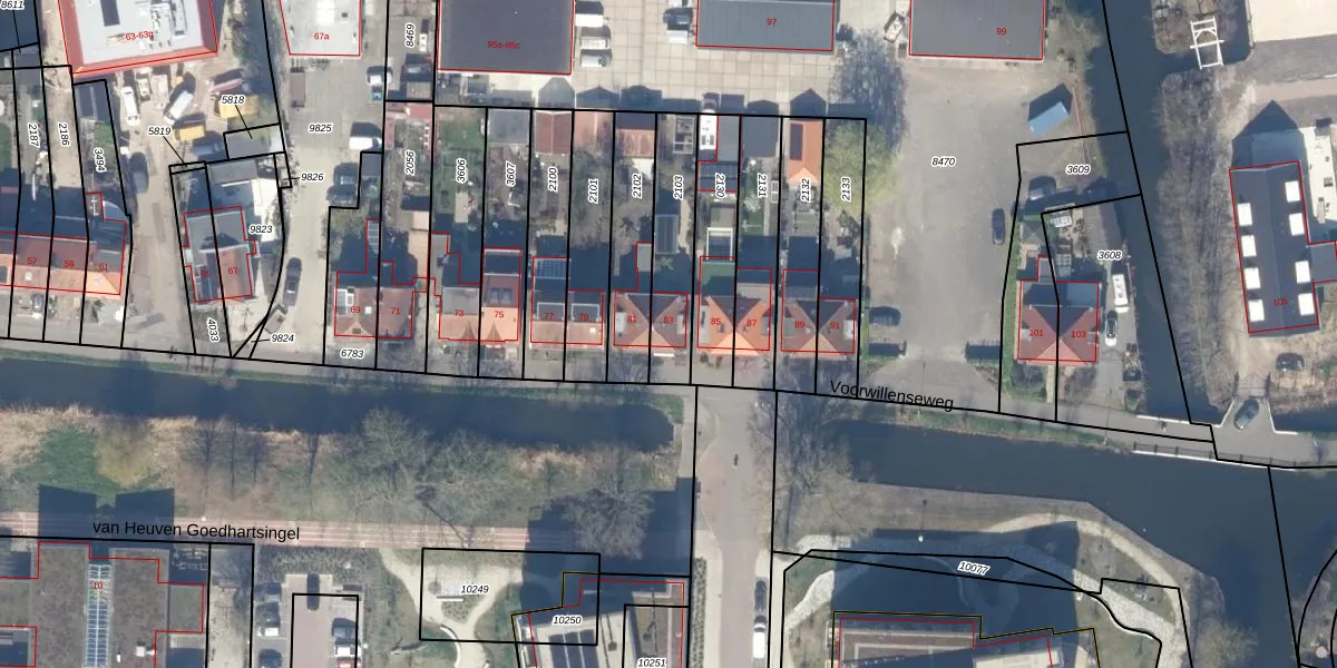 Voorwillenseweg 83 is gelegen op kadastraal perceel GDA01K2103. Deze kadastrale aanduiding is uniek en wordt gebruikt door het Kadaster om eigendomsrechten en andere zakelijke rechten vast te leggen. Het perceel maakt onderdeel uit van de kadastrale gemeente Gouda.