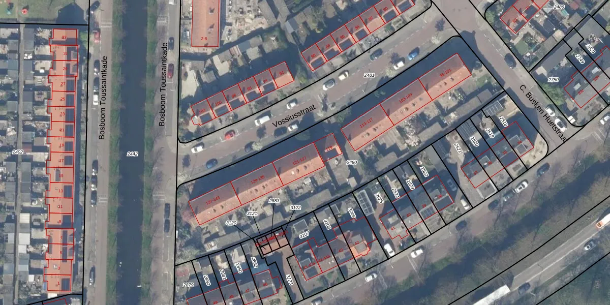 Het perceel waarop Vossiusstraat 121 staat heeft een oppervlakte van 2831 m². Dit is een zeer groot perceel. De perceeloppervlakte wordt geregistreerd door het Kadaster. Gedetailleerde informatie over de maten van dit perceel kunt u vinden in het rapport Kadastrale kaart met maatvoering van Vossiusstraat 121.