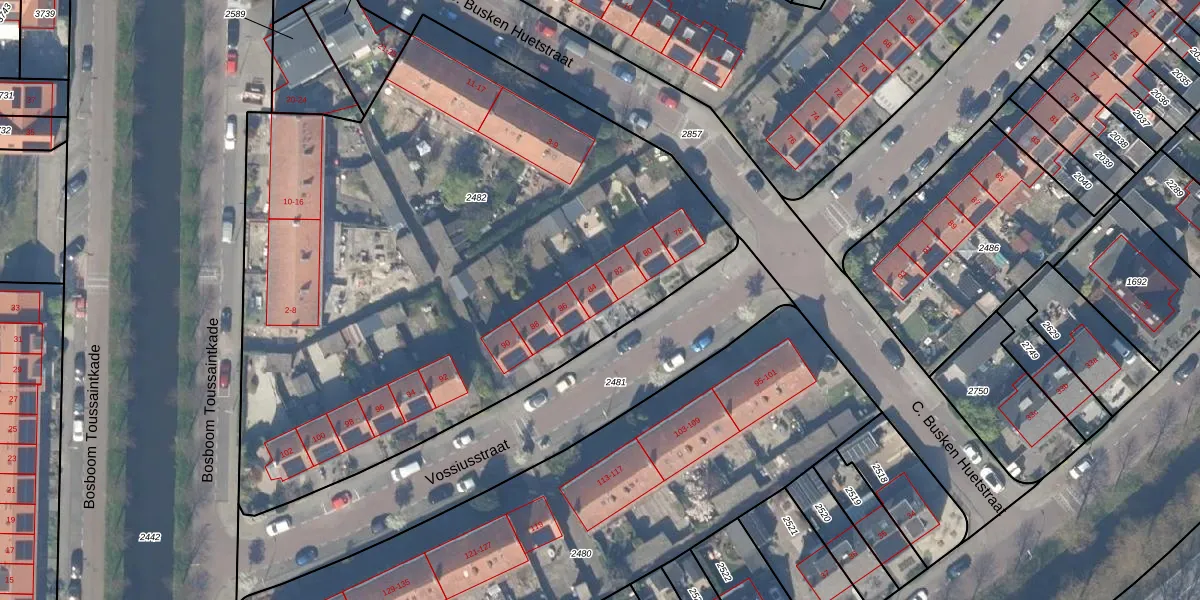 Het perceel waarop Vossiusstraat 84 staat heeft een oppervlakte van 4027 m². Dit is een zeer groot perceel. De perceeloppervlakte wordt geregistreerd door het Kadaster. Gedetailleerde informatie over de maten van dit perceel kunt u vinden in het rapport Kadastrale kaart met maatvoering van Vossiusstraat 84.
