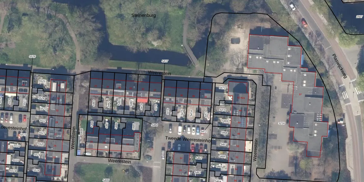 Weerestein 36 is gelegen op kadastraal perceel GDA01M5475. Deze kadastrale aanduiding is uniek en wordt gebruikt door het Kadaster om eigendomsrechten en andere zakelijke rechten vast te leggen. Het perceel maakt onderdeel uit van de kadastrale gemeente Gouda.