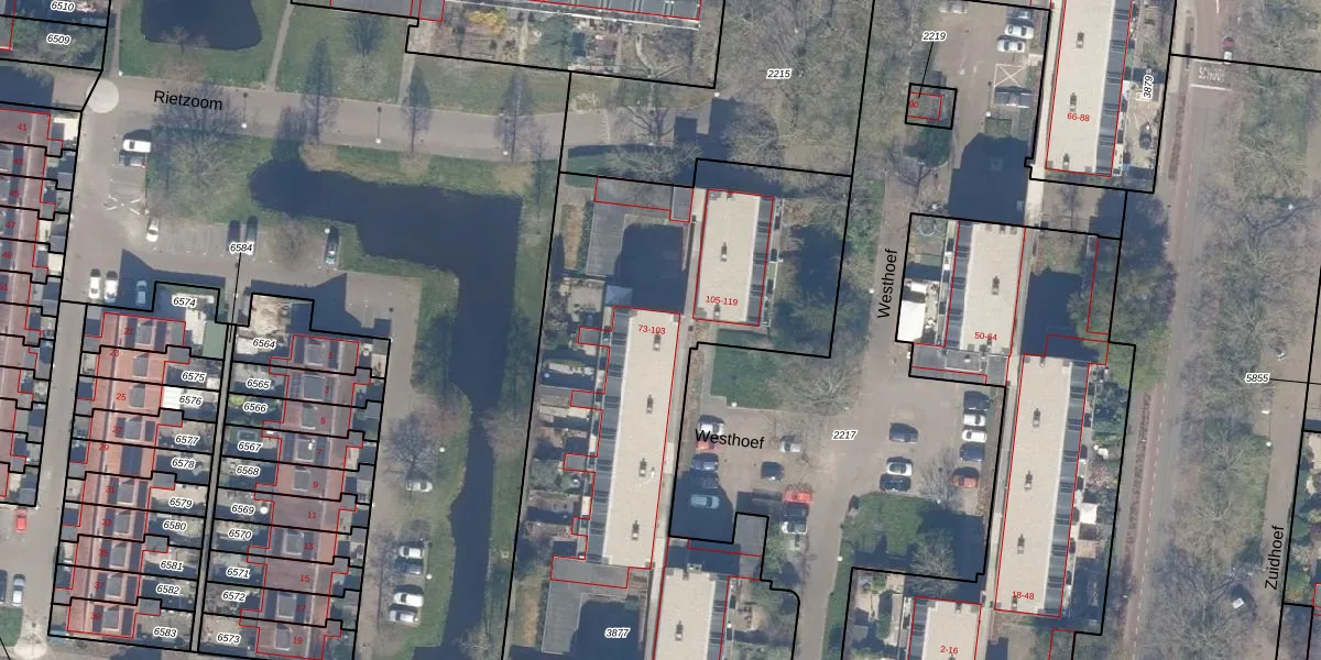 Het perceel waarop Westhoef 103 staat heeft een oppervlakte van 5376 m². Dit is een zeer groot perceel. De perceeloppervlakte wordt geregistreerd door het Kadaster. Gedetailleerde informatie over de maten van dit perceel kunt u vinden in het rapport Kadastrale kaart met maatvoering van Westhoef 103.