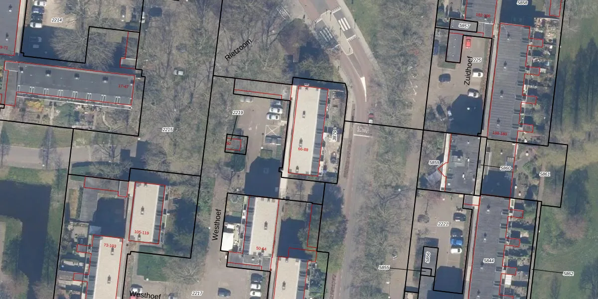 Het perceel waarop Westhoef 72 staat heeft een oppervlakte van 733 m². Dit is een groot perceel. De perceeloppervlakte wordt geregistreerd door het Kadaster. Gedetailleerde informatie over de maten van dit perceel kunt u vinden in het rapport Kadastrale kaart met maatvoering van Westhoef 72.
