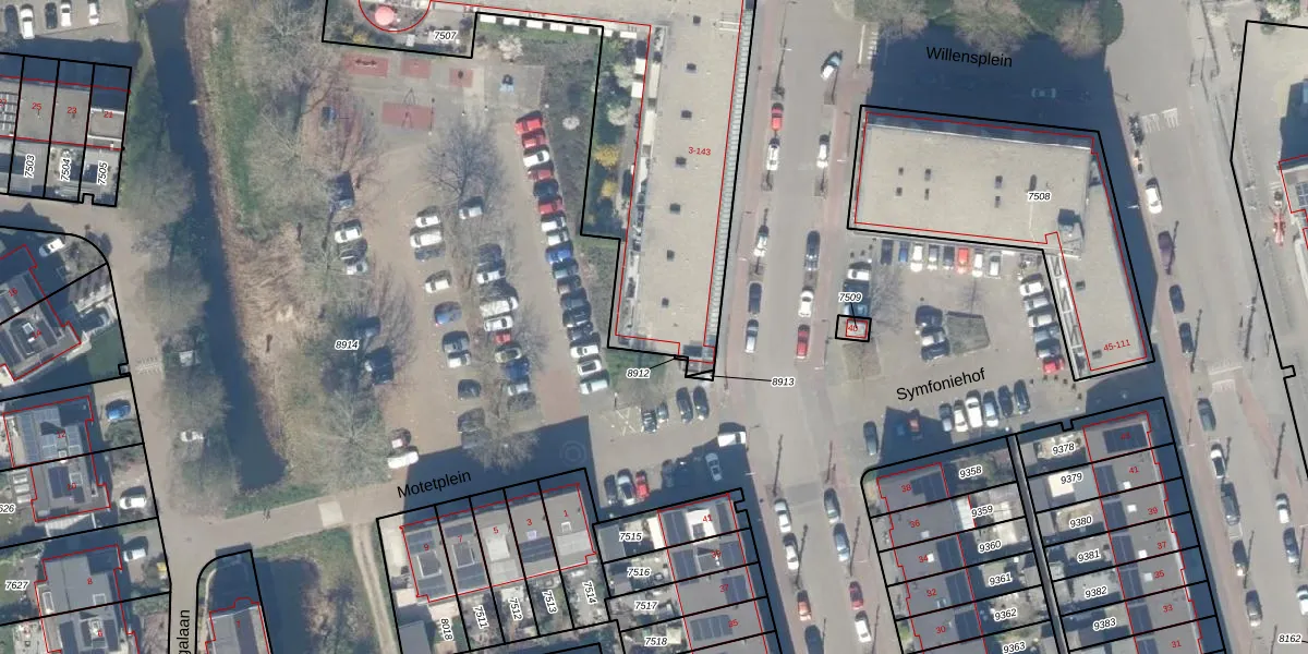 Het perceel waarop Willensplein 101 staat heeft een oppervlakte van 2300 m². Dit is een zeer groot perceel. De perceeloppervlakte wordt geregistreerd door het Kadaster. Gedetailleerde informatie over de maten van dit perceel kunt u vinden in het rapport Kadastrale kaart met maatvoering van Willensplein 101.