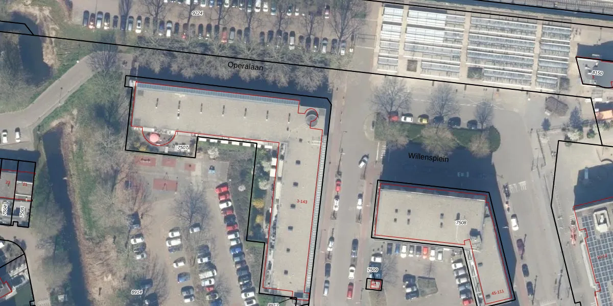Het perceel waarop Willensplein 45 staat heeft een oppervlakte van 2300 m². Dit is een zeer groot perceel. De perceeloppervlakte wordt geregistreerd door het Kadaster. Gedetailleerde informatie over de maten van dit perceel kunt u vinden in het rapport Kadastrale kaart met maatvoering van Willensplein 45.