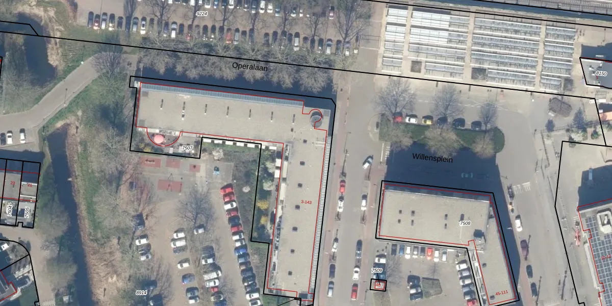 Het perceel waarop Willensplein 65 staat heeft een oppervlakte van 2300 m². Dit is een zeer groot perceel. De perceeloppervlakte wordt geregistreerd door het Kadaster. Gedetailleerde informatie over de maten van dit perceel kunt u vinden in het rapport Kadastrale kaart met maatvoering van Willensplein 65.