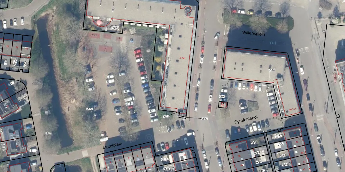 Het perceel waarop Willensplein 97 staat heeft een oppervlakte van 2300 m². Dit is een zeer groot perceel. De perceeloppervlakte wordt geregistreerd door het Kadaster. Gedetailleerde informatie over de maten van dit perceel kunt u vinden in het rapport Kadastrale kaart met maatvoering van Willensplein 97.