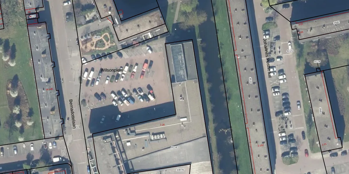 Het perceel waarop Wilsonplein 1 staat heeft een oppervlakte van 3279 m². Dit is een zeer groot perceel. De perceeloppervlakte wordt geregistreerd door het Kadaster. Gedetailleerde informatie over de maten van dit perceel kunt u vinden in het rapport Kadastrale kaart met maatvoering van Wilsonplein 1.