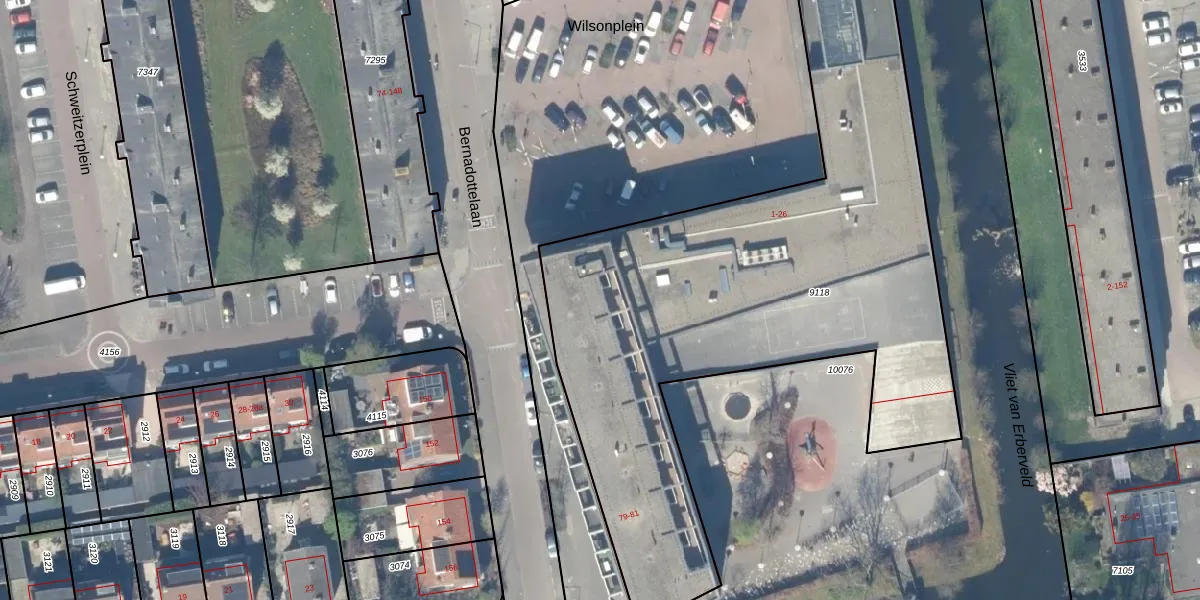 Het perceel waarop Wilsonplein 11 staat heeft een oppervlakte van 3279 m². Dit is een zeer groot perceel. De perceeloppervlakte wordt geregistreerd door het Kadaster. Gedetailleerde informatie over de maten van dit perceel kunt u vinden in het rapport Kadastrale kaart met maatvoering van Wilsonplein 11.