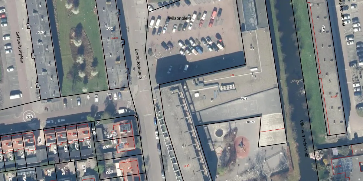 Het perceel waarop Wilsonplein 26 staat heeft een oppervlakte van 3279 m². Dit is een zeer groot perceel. De perceeloppervlakte wordt geregistreerd door het Kadaster. Gedetailleerde informatie over de maten van dit perceel kunt u vinden in het rapport Kadastrale kaart met maatvoering van Wilsonplein 26.