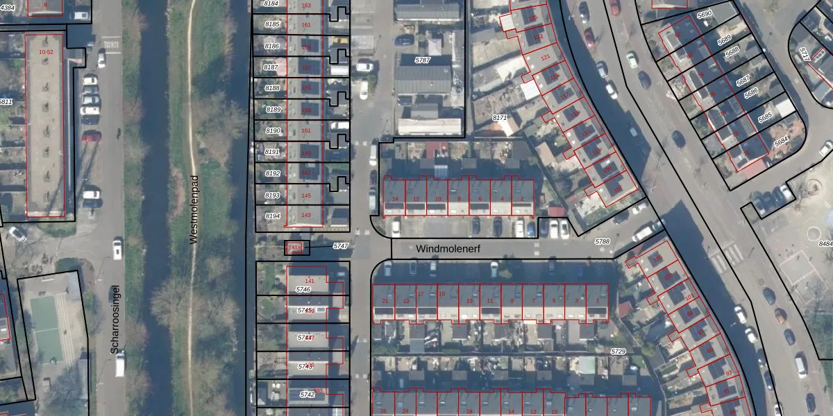 Het perceel waarop Windmolenerf 12 staat heeft een oppervlakte van 3029 m². Dit is een zeer groot perceel. De perceeloppervlakte wordt geregistreerd door het Kadaster. Gedetailleerde informatie over de maten van dit perceel kunt u vinden in het rapport Kadastrale kaart met maatvoering van Windmolenerf 12.