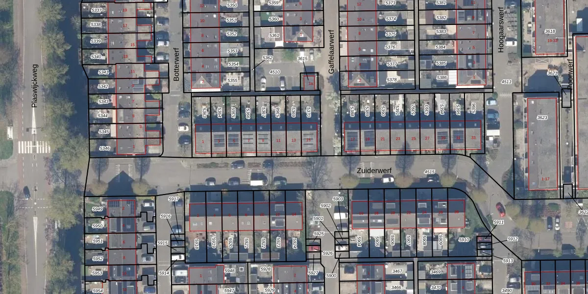 Het perceel waarop Zuiderwerf 13 staat heeft een oppervlakte van 106 m². Dit is een middelgroot perceel. De perceeloppervlakte wordt geregistreerd door het Kadaster. Gedetailleerde informatie over de maten van dit perceel kunt u vinden in het rapport Kadastrale kaart met maatvoering van Zuiderwerf 13.
