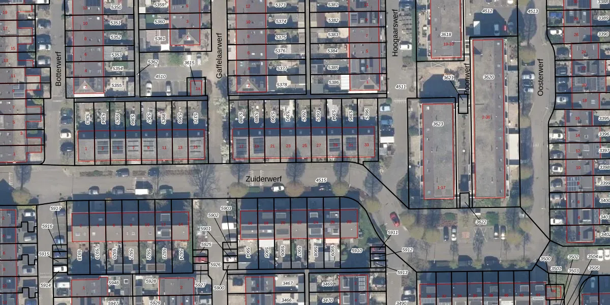 Het perceel waarop Zuiderwerf 25 staat heeft een oppervlakte van 106 m². Dit is een middelgroot perceel. De perceeloppervlakte wordt geregistreerd door het Kadaster. Gedetailleerde informatie over de maten van dit perceel kunt u vinden in het rapport Kadastrale kaart met maatvoering van Zuiderwerf 25.