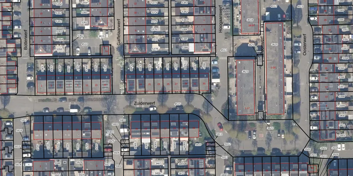 Gebruik de zoekbalk of klik op een perceel voor informatie over de adressen binnen dit perceel.