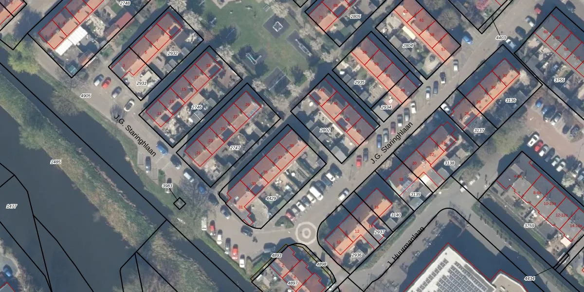 J.G. Staringhlaan 39 is gelegen op kadastraal perceel GDR02B4429. Deze kadastrale aanduiding is uniek en wordt gebruikt door het Kadaster om eigendomsrechten en andere zakelijke rechten vast te leggen. Het perceel maakt onderdeel uit van de kadastrale gemeente Gouderak.
