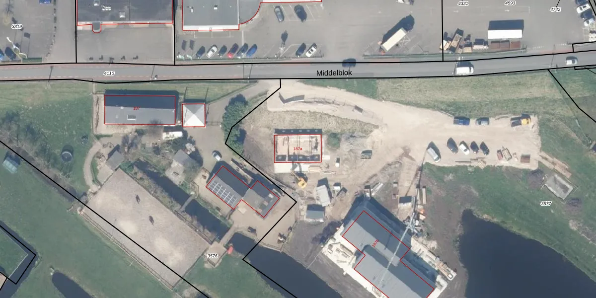 Het perceel waarop Middelblok 187-a staat heeft een oppervlakte van 2,5 ha. Dit is een zeer groot perceel. De perceeloppervlakte wordt geregistreerd door het Kadaster. Gedetailleerde informatie over de maten van dit perceel kunt u vinden in het rapport Kadastrale kaart met maatvoering van Middelblok 187-a.