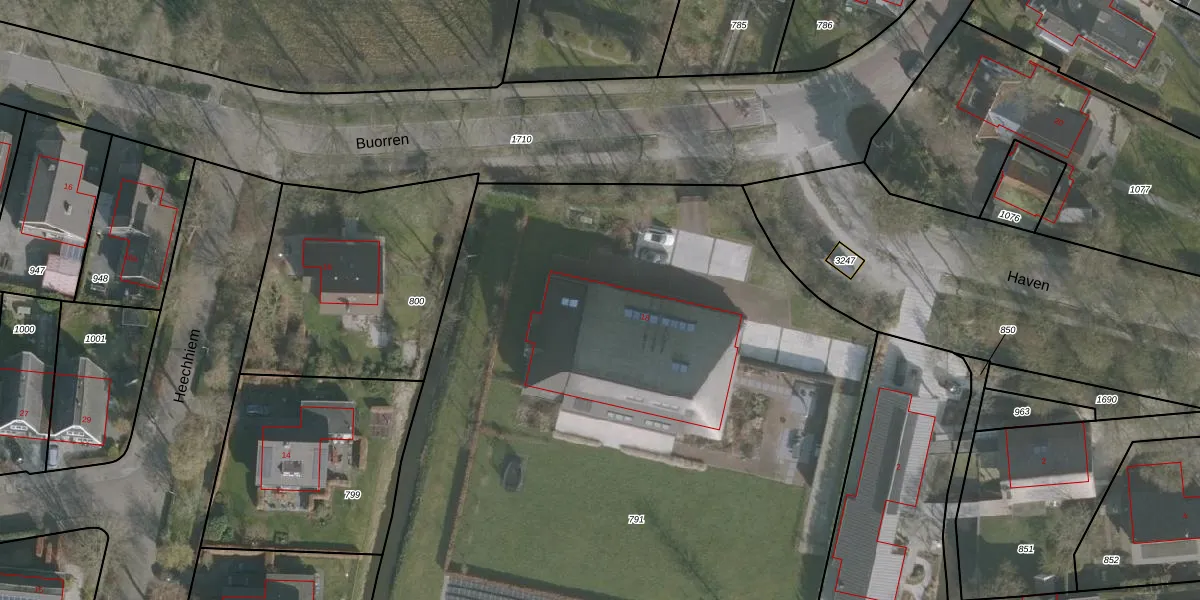 Het perceel waarop Buorren 18 staat heeft een oppervlakte van 5245 m². Dit is een zeer groot perceel. De perceeloppervlakte wordt geregistreerd door het Kadaster. Gedetailleerde informatie over de maten van dit perceel kunt u vinden in het rapport Kadastrale kaart met maatvoering van Buorren 18.