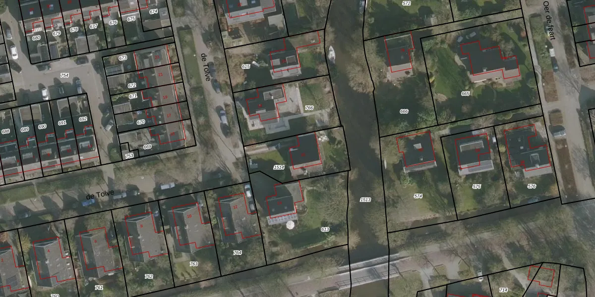 Het perceel waarop de Tolve 16 staat heeft een oppervlakte van 468 m². Dit is een groot perceel. De perceeloppervlakte wordt geregistreerd door het Kadaster. Gedetailleerde informatie over de maten van dit perceel kunt u vinden in het rapport Kadastrale kaart met maatvoering van de Tolve 16.