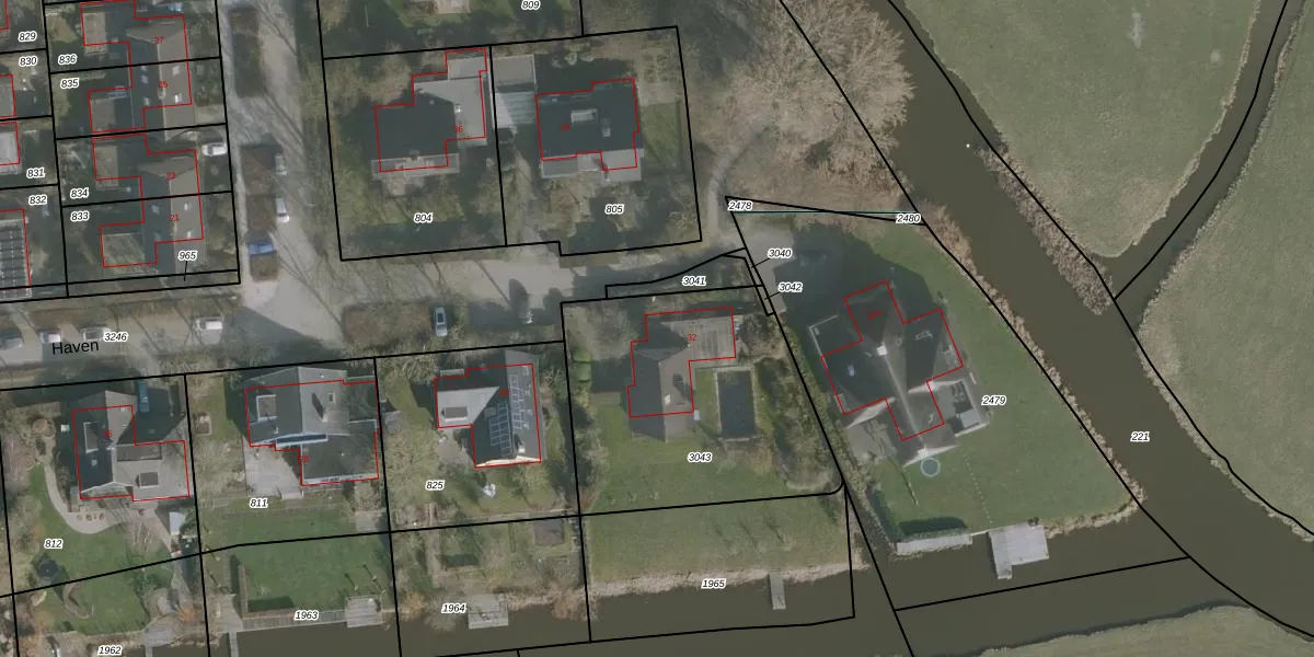 Het perceel waarop Haven 32 staat heeft een oppervlakte van 1163 m². Dit is een zeer groot perceel. De perceeloppervlakte wordt geregistreerd door het Kadaster. Gedetailleerde informatie over de maten van dit perceel kunt u vinden in het rapport Kadastrale kaart met maatvoering van Haven 32.