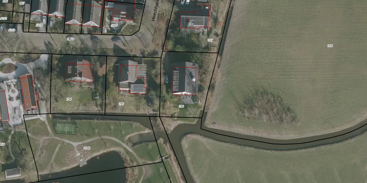 Het perceel waarop Heechhiem 8 staat heeft een oppervlakte van 966 m². Dit is een groot perceel. De perceeloppervlakte wordt geregistreerd door het Kadaster. Gedetailleerde informatie over de maten van dit perceel kunt u vinden in het rapport Kadastrale kaart met maatvoering van Heechhiem 8.