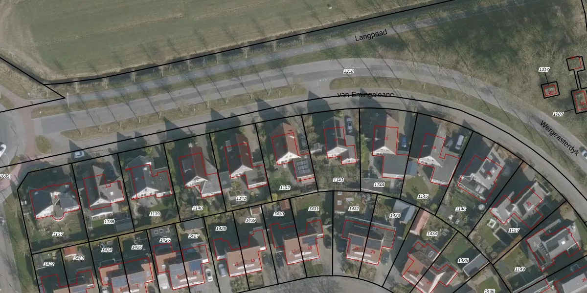 Het perceel waarop van Emingaleane 12 staat heeft een oppervlakte van 437 m². Dit is een groot perceel. De perceeloppervlakte wordt geregistreerd door het Kadaster. Gedetailleerde informatie over de maten van dit perceel kunt u vinden in het rapport Kadastrale kaart met maatvoering van van Emingaleane 12.