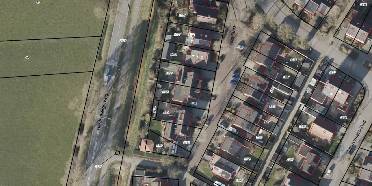 Het perceel waarop De Mars 9 staat heeft een oppervlakte van 317 m². Dit is een groot perceel. De perceeloppervlakte wordt geregistreerd door het Kadaster. Gedetailleerde informatie over de maten van dit perceel kunt u vinden in het rapport Kadastrale kaart met maatvoering van De Mars 9.