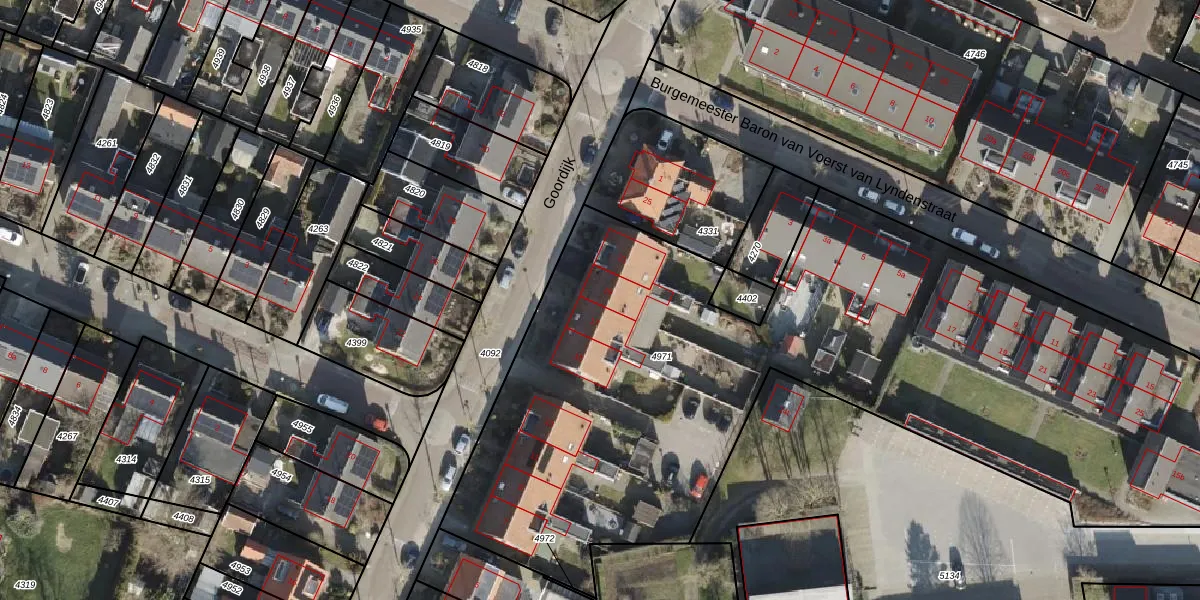 Het perceel waarop Goordijk 19 staat heeft een oppervlakte van 4578 m². Dit is een zeer groot perceel. De perceeloppervlakte wordt geregistreerd door het Kadaster. Gedetailleerde informatie over de maten van dit perceel kunt u vinden in het rapport Kadastrale kaart met maatvoering van Goordijk 19.