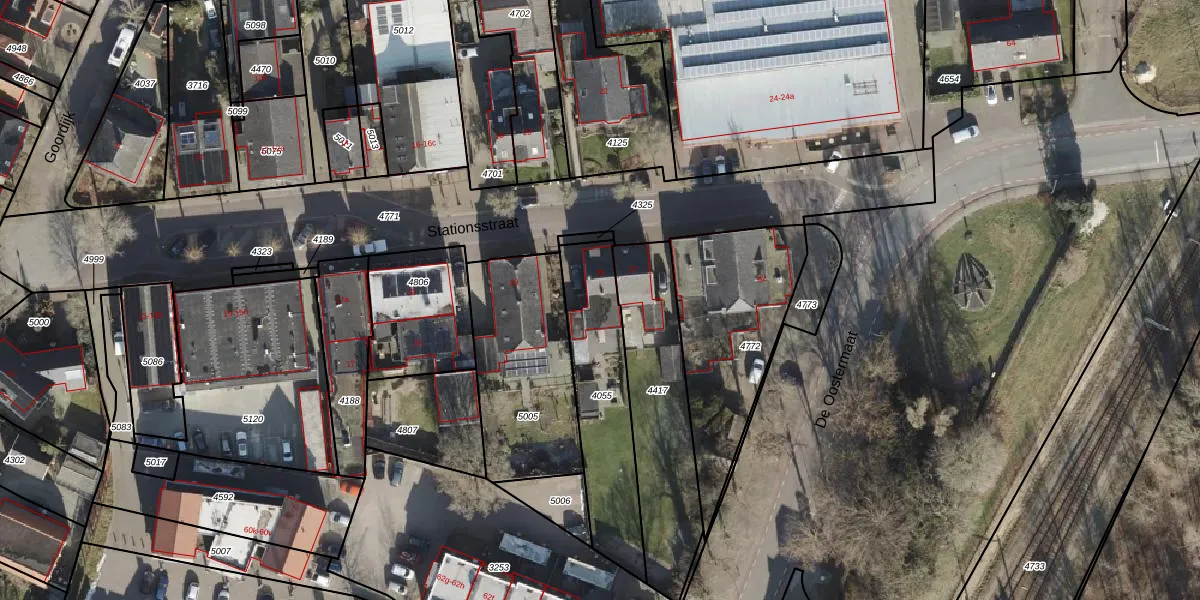 Het perceel waarop Stationsstraat 25 staat heeft een oppervlakte van 475 m². Dit is een groot perceel. De perceeloppervlakte wordt geregistreerd door het Kadaster. Gedetailleerde informatie over de maten van dit perceel kunt u vinden in het rapport Kadastrale kaart met maatvoering van Stationsstraat 25.