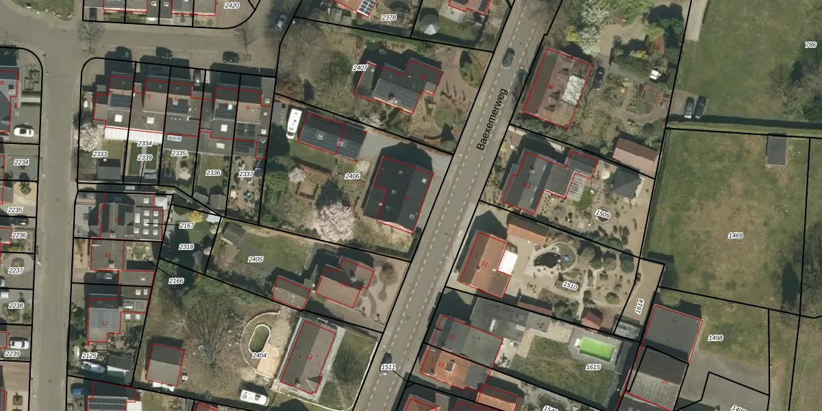 Het perceel waarop Baexemerweg 16 staat heeft een oppervlakte van 1255 m². Dit is een zeer groot perceel. De perceeloppervlakte wordt geregistreerd door het Kadaster. Gedetailleerde informatie over de maten van dit perceel kunt u vinden in het rapport Kadastrale kaart met maatvoering van Baexemerweg 16.