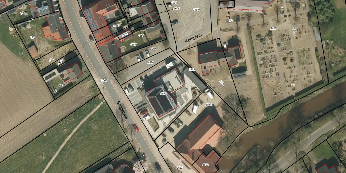 Het perceel waarop Brugstraat 15-f staat heeft een oppervlakte van 1239 m². Dit is een zeer groot perceel. De perceeloppervlakte wordt geregistreerd door het Kadaster. Gedetailleerde informatie over de maten van dit perceel kunt u vinden in het rapport Kadastrale kaart met maatvoering van Brugstraat 15-f.