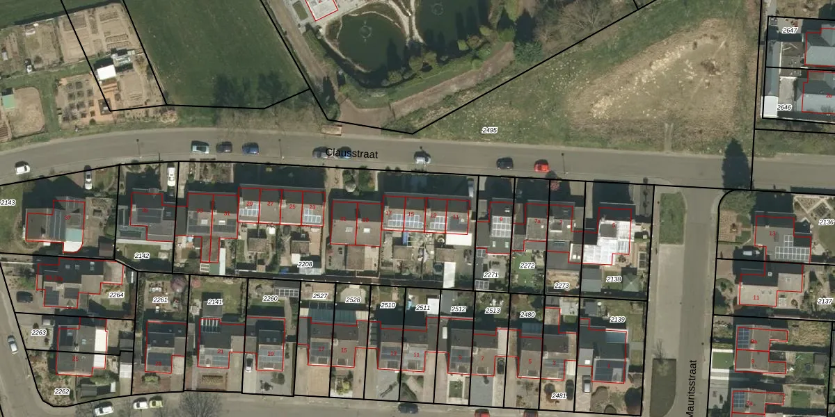 Het perceel waarop Clausstraat 15 staat heeft een oppervlakte van 1994 m². Dit is een zeer groot perceel. De perceeloppervlakte wordt geregistreerd door het Kadaster. Gedetailleerde informatie over de maten van dit perceel kunt u vinden in het rapport Kadastrale kaart met maatvoering van Clausstraat 15.