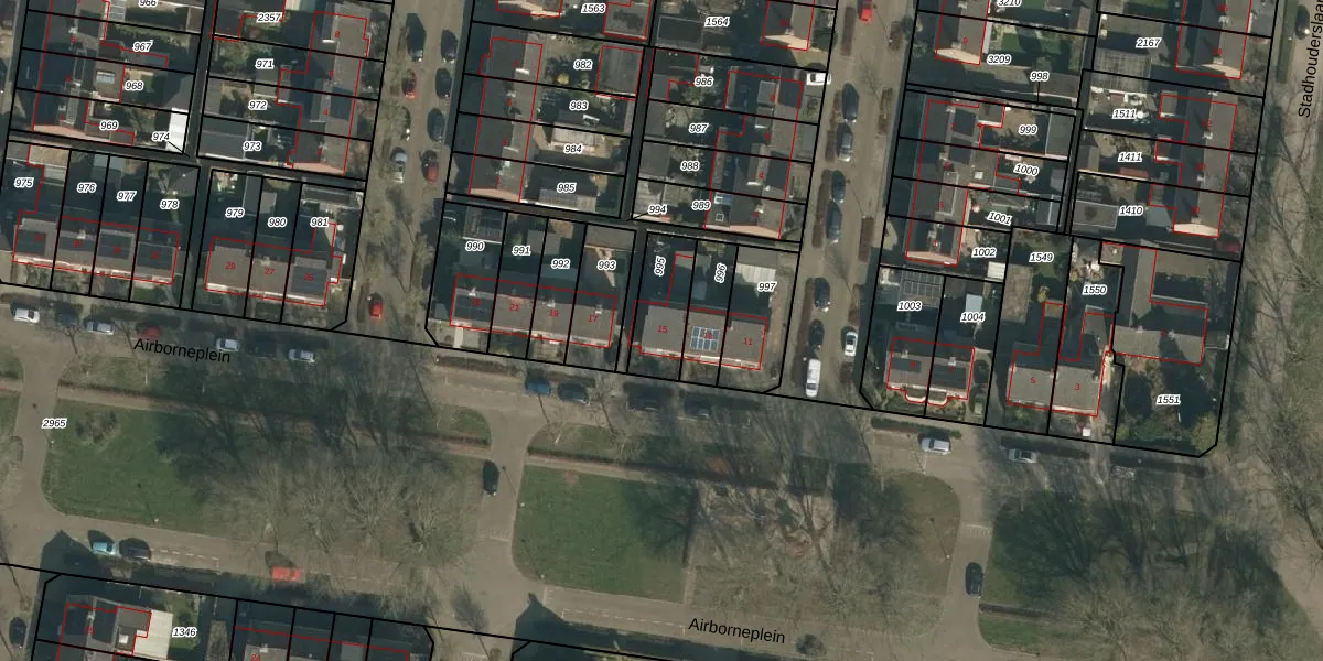 Het perceel waarop Airborneplein 15 staat heeft een oppervlakte van 166 m². Dit is een middelgroot perceel. De perceeloppervlakte wordt geregistreerd door het Kadaster. Gedetailleerde informatie over de maten van dit perceel kunt u vinden in het rapport Kadastrale kaart met maatvoering van Airborneplein 15.