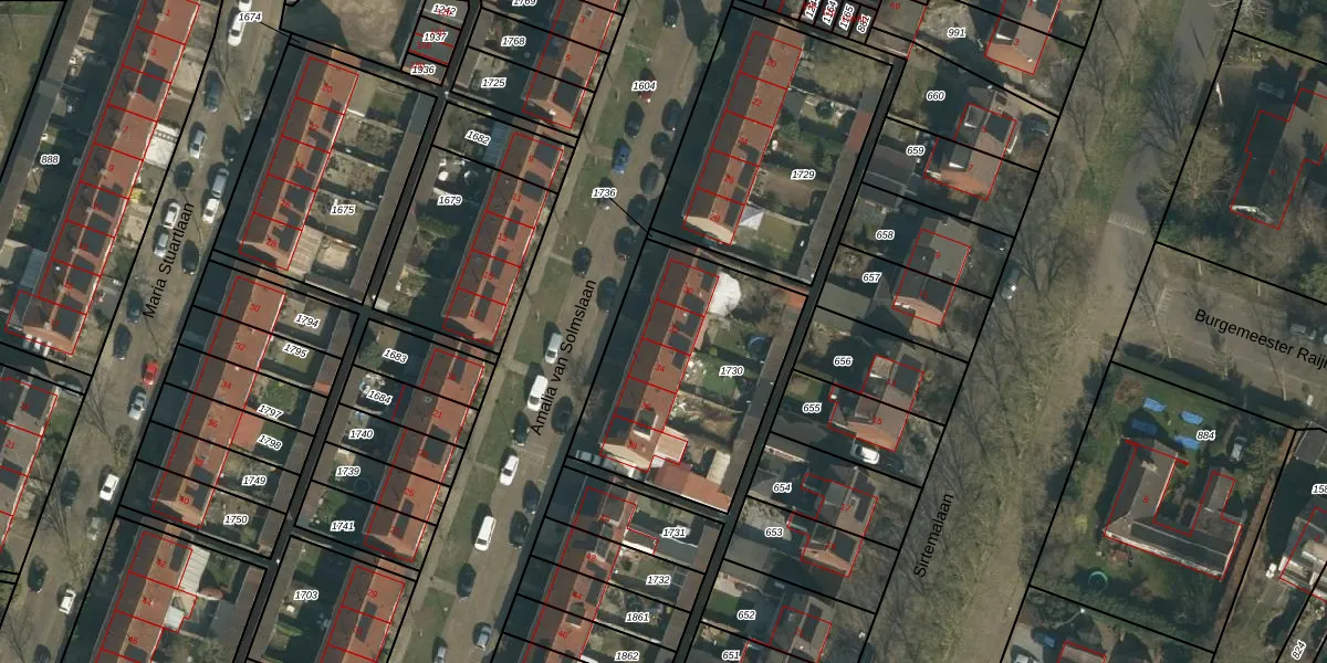 Het perceel waarop Amalia van Solmslaan 32 staat heeft een oppervlakte van 902 m². Dit is een groot perceel. De perceeloppervlakte wordt geregistreerd door het Kadaster. Gedetailleerde informatie over de maten van dit perceel kunt u vinden in het rapport Kadastrale kaart met maatvoering van Amalia van Solmslaan 32.