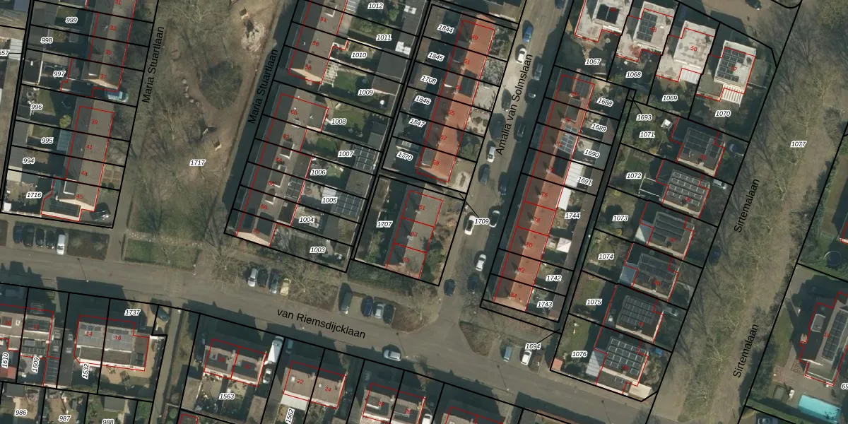 Het perceel waarop Amalia van Solmslaan 61 staat heeft een oppervlakte van 439 m². Dit is een groot perceel. De perceeloppervlakte wordt geregistreerd door het Kadaster. Gedetailleerde informatie over de maten van dit perceel kunt u vinden in het rapport Kadastrale kaart met maatvoering van Amalia van Solmslaan 61.
