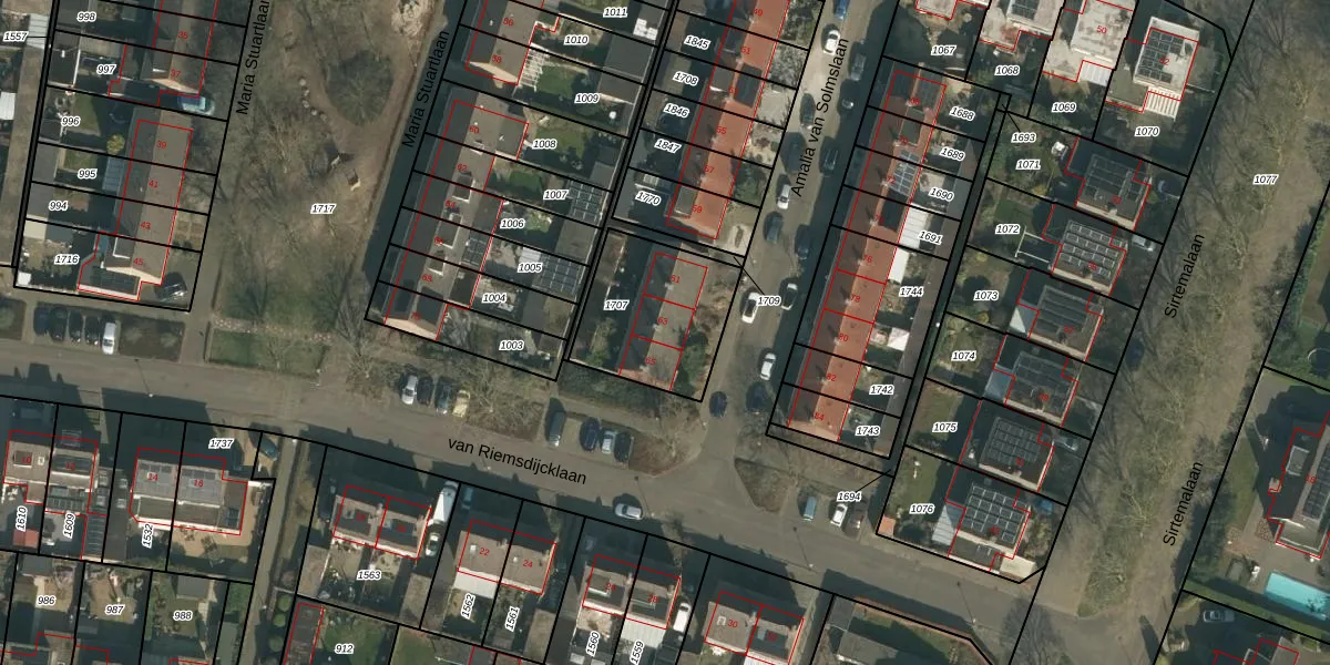 Het perceel waarop Amalia van Solmslaan 63 staat heeft een oppervlakte van 439 m². Dit is een groot perceel. De perceeloppervlakte wordt geregistreerd door het Kadaster. Gedetailleerde informatie over de maten van dit perceel kunt u vinden in het rapport Kadastrale kaart met maatvoering van Amalia van Solmslaan 63.
