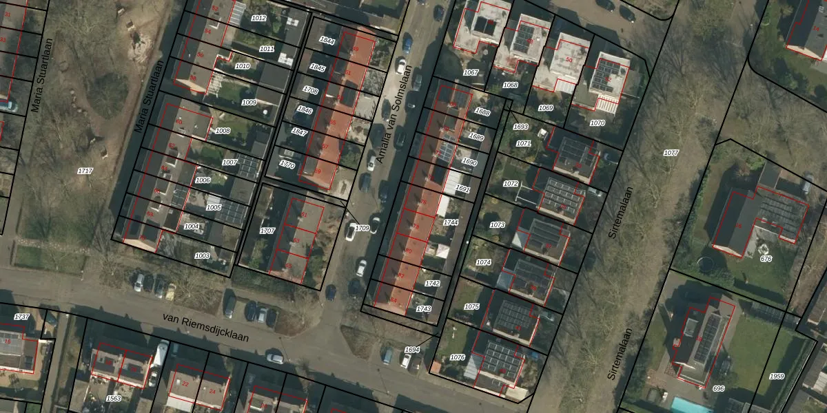 Het perceel waarop Amalia van Solmslaan 76 staat heeft een oppervlakte van 348 m². Dit is een groot perceel. De perceeloppervlakte wordt geregistreerd door het Kadaster. Gedetailleerde informatie over de maten van dit perceel kunt u vinden in het rapport Kadastrale kaart met maatvoering van Amalia van Solmslaan 76.