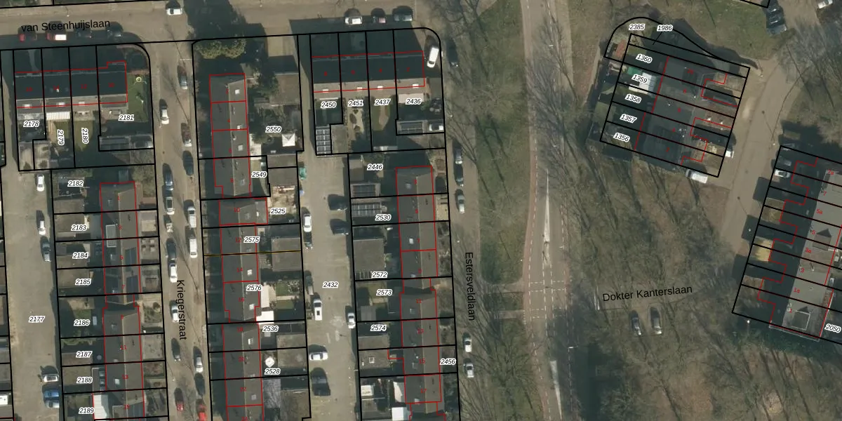 Estersveldlaan 5 is gelegen op kadastraal perceel GVE00E2530. Deze kadastrale aanduiding is uniek en wordt gebruikt door het Kadaster om eigendomsrechten en andere zakelijke rechten vast te leggen. Het perceel maakt onderdeel uit van de kadastrale gemeente Grave.